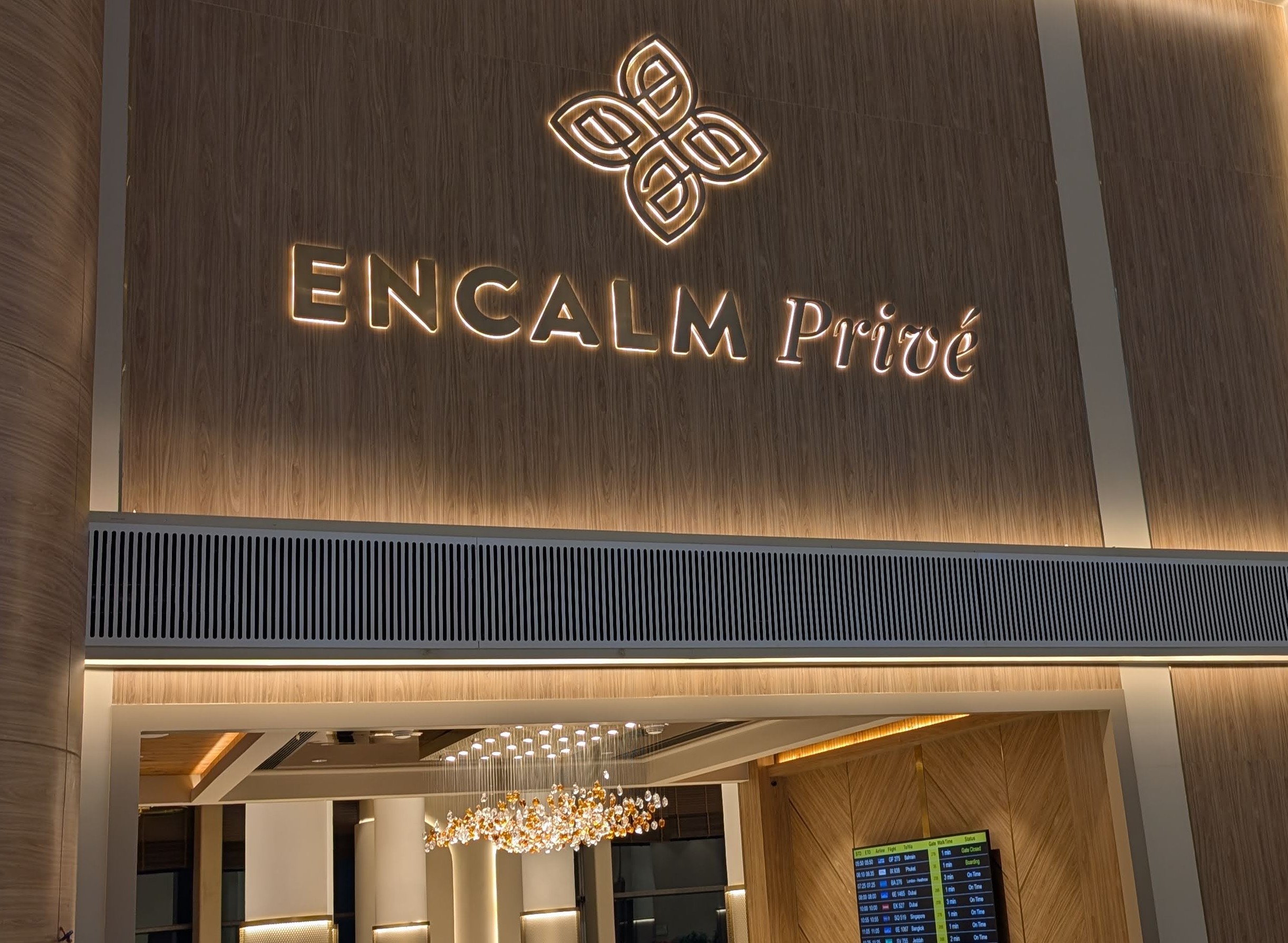 - Encalm Privé lounge has beautiful wooden accents and bright golden brown decor (reminds me of Emirates First Class).